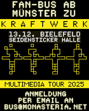 Die Electro-Pioniere Kraftwerk kommen endlich wieder auf ausgiebige Hallentournee queer durch Deutschland nachdem es in den letzten Jahren lediglich Open Airs und spezielle Einzelauftritte gab. Am 13.12. gastiert die Band in der Seidenstickerhalle in Bielefeld und ab Münster wird es für die Fans eine Busreise geben. Die Kosten betragen 35 Euro pro Person für Hin- und Rückfahrt, los geht es um 16:45 Uhr auf dem Fernbusparkplatz neben dem Club "Gleis 22". Wer Interesse hat mitzufahren, kann sich per Email an bus@monasteria.net anmelden. (Achtung: Konzertkarte wird vorausgesetzt und wird nicht gestellt!) | |